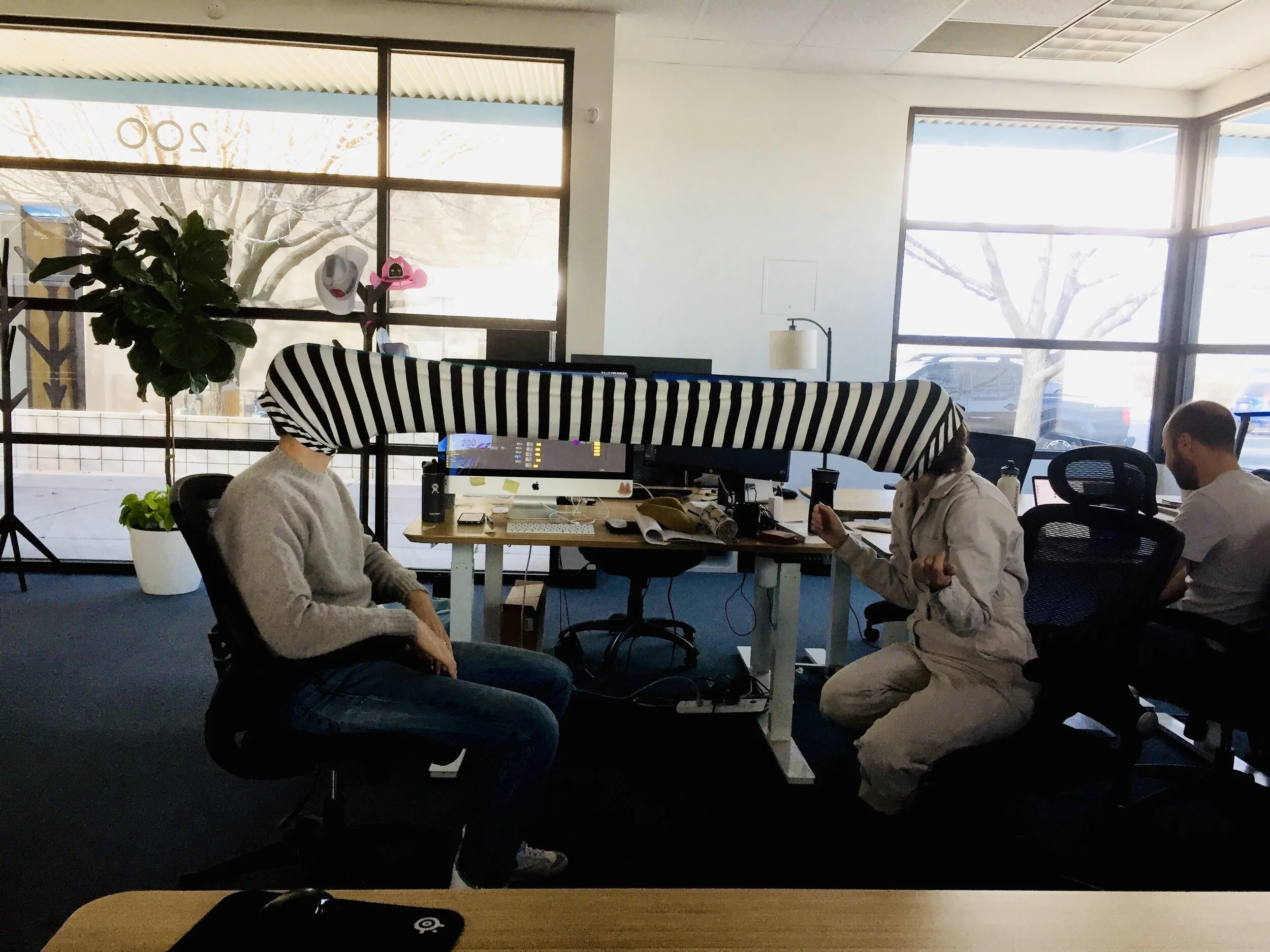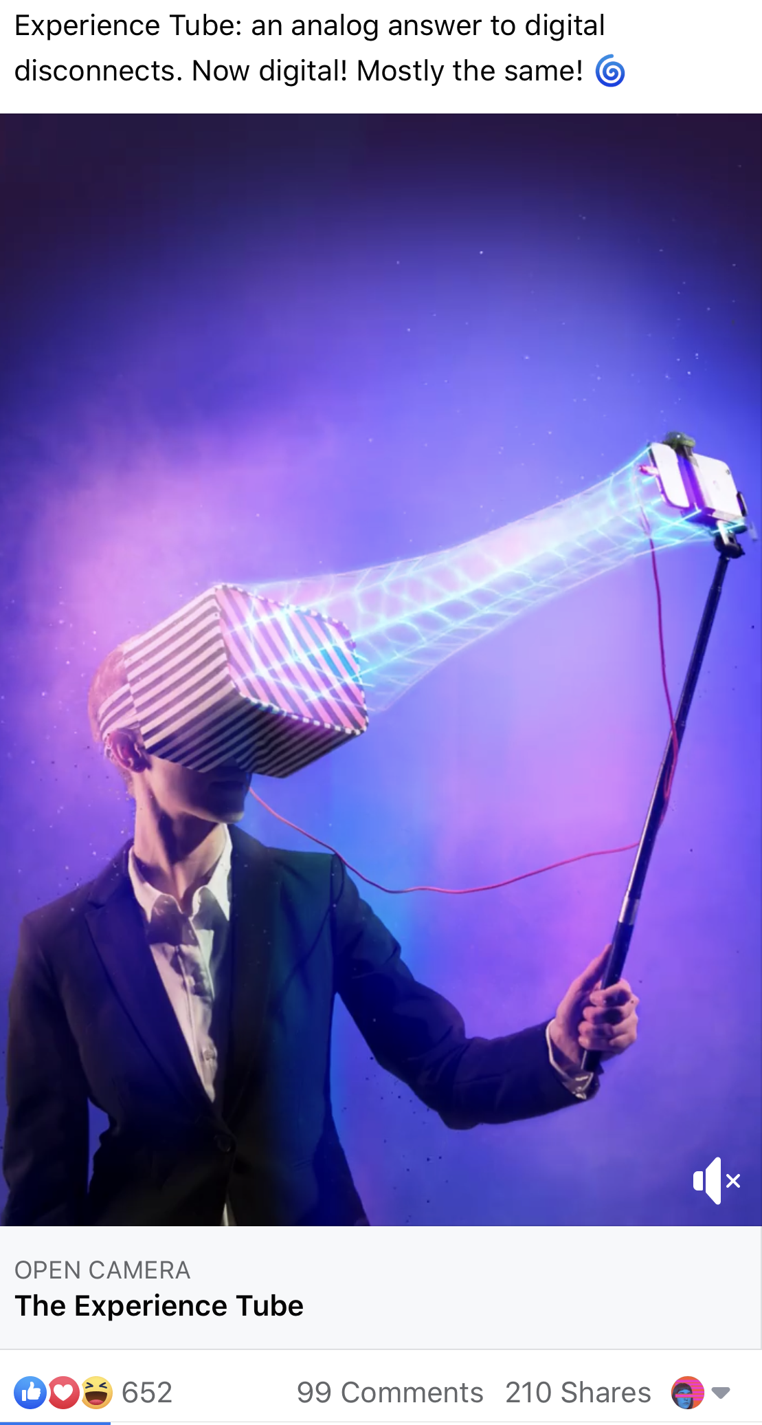 At Meow Wolf, we wanted to experiment with Facebooks new AR advertising feature. Most AR ad campaigns we had seen were advertising a wearable product, such as sunglasses or cosmetics. We wanted to play with that expectation, by creating an ad for the Experience Tube by Nick Toll. The Experience Tube is a tube of striped cloth that two people wear between their faces. Trust me, its great. We loved the absurdity of scrolling through your feed and seeing a face in a spiral that implores, ‘ this is a real thing you can buy!’